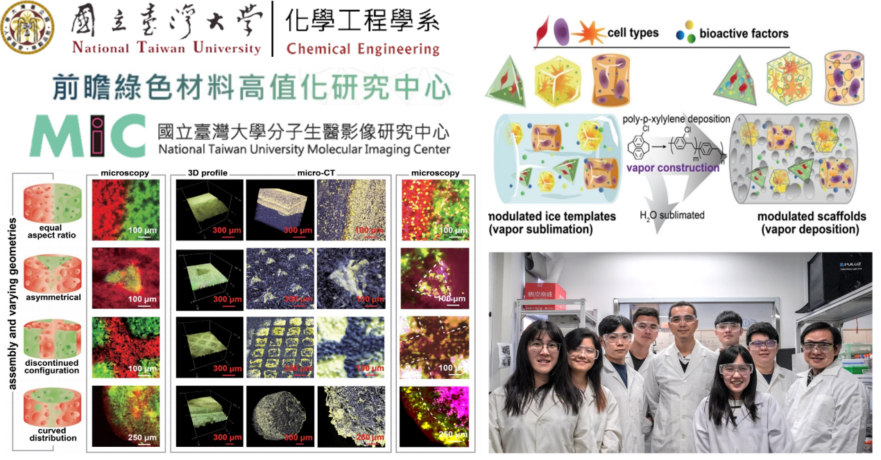 組織工程支架材料提供了再造或者修復器官及組織等再生醫學技術之發展。近代先進工程支架的發展也成功開發更複雜的分子與支架結構靈活性,允許在物理和化學方面進行多功能組裝組織工程支架,並模擬天然細胞外基質(ECM)。然而目前面臨之挑戰仍然包括細胞-細胞聚集、多種類型細胞的分佈和定位、細胞類型的共培養、生物分子的分佈和定位、潛在的免疫反應、細胞-材料之間相互作用的操控等限制。本校工學院化工系、前瞻綠色材料高值化研究中心、分子生醫影像研究中心陳賢燁教授的研究團隊在組織工程支架材料的探索中,以突破技術在氣體的環境之下可藉由操控氣體分子的熱力學性質,使氣體分子進行昇華(sublimation)以及沉積(deposition)的途徑來製造並模組化組織工程支架。在同一個支架中由特定功能模塊的空間排列組成,在不同細胞類型和生物微環境之間建立了重要的生物界限。此創新的製程,無須先進的設備,步驟簡單不耗時,並具備大量生產的潛力。在材料製造的過程中,可以輕易調控支架材料的幾何形狀,調控各種重要的材料物理機械特性例如,材料軟硬度,孔洞大小,孔隙率,以及調控化學生物特性,例如選擇性分佈生物分子以及活細胞的種類及組成比例來構成細胞組織生長所需的精密環境。