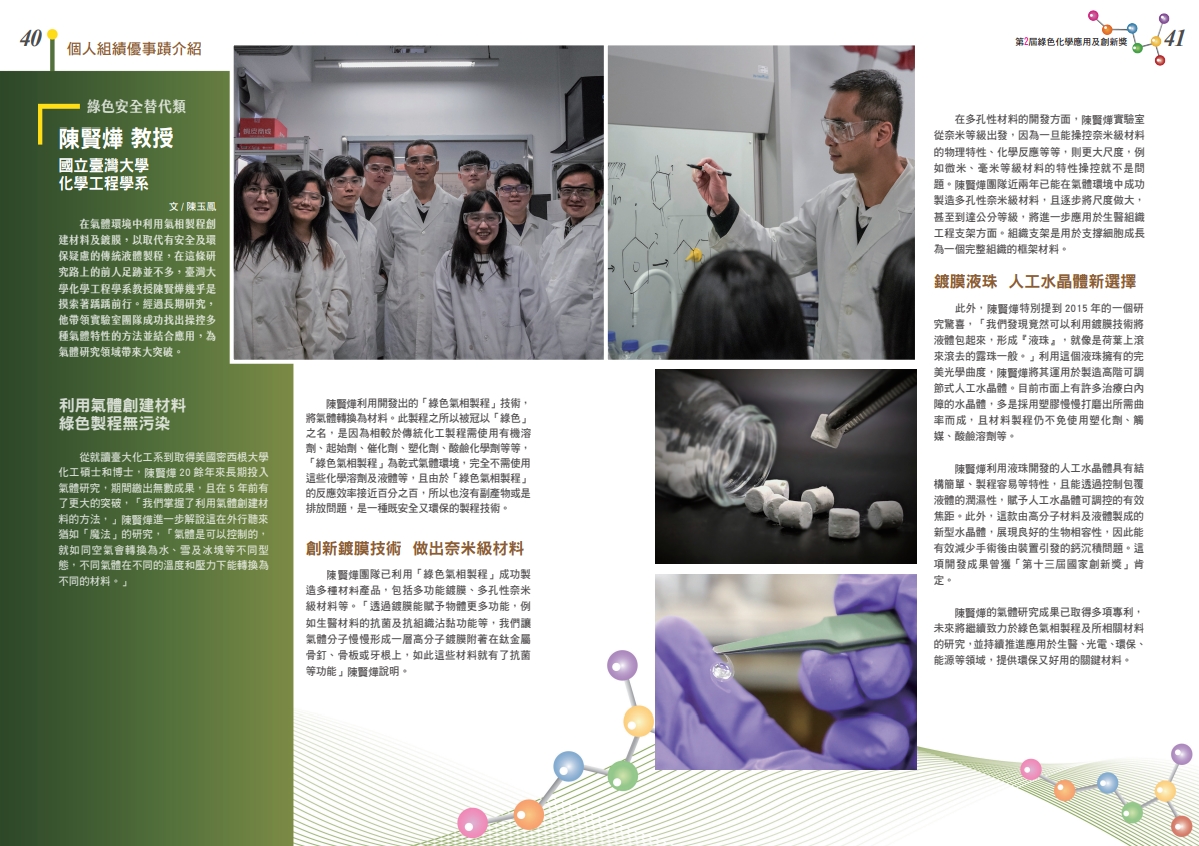 台灣大學化工系陳賢燁教授在氣體環境中利用氣相製程創建材料及鍍膜,以取代有安全及環保疑慮的傳統液體製程,在這條研究道路上的前人足跡並不多,陳教授幾乎是摸索著踽踽前行。經過長期研究,他帶領實驗室團隊成功找出操控多種氣體特性的方法並結合應用,為氣體研究領域帶來大突破。此製程之所以被冠以綠色之名,在於相較於傳統化工製程需使用有機溶劑、起始劑、催化劑、塑化劑、酸鹼化學劑等等,綠色氣相製程為乾式氣體環境,完全不需使用這些化學溶劑及液體等,且由於綠色氣象製程的反應效率接近百分之百,所以也沒有副產物或是排放問題,是一種既安全又環保的製程技術,並透過此次綠色化學應用及創新獎的參賽,讓此創新綠色製程能夠成為各領域企業及先進學習效仿的方式,推廣綠色化學理念,促使全民參與綠色化學推動工作,以實現「永續、安全、環保」的願景!