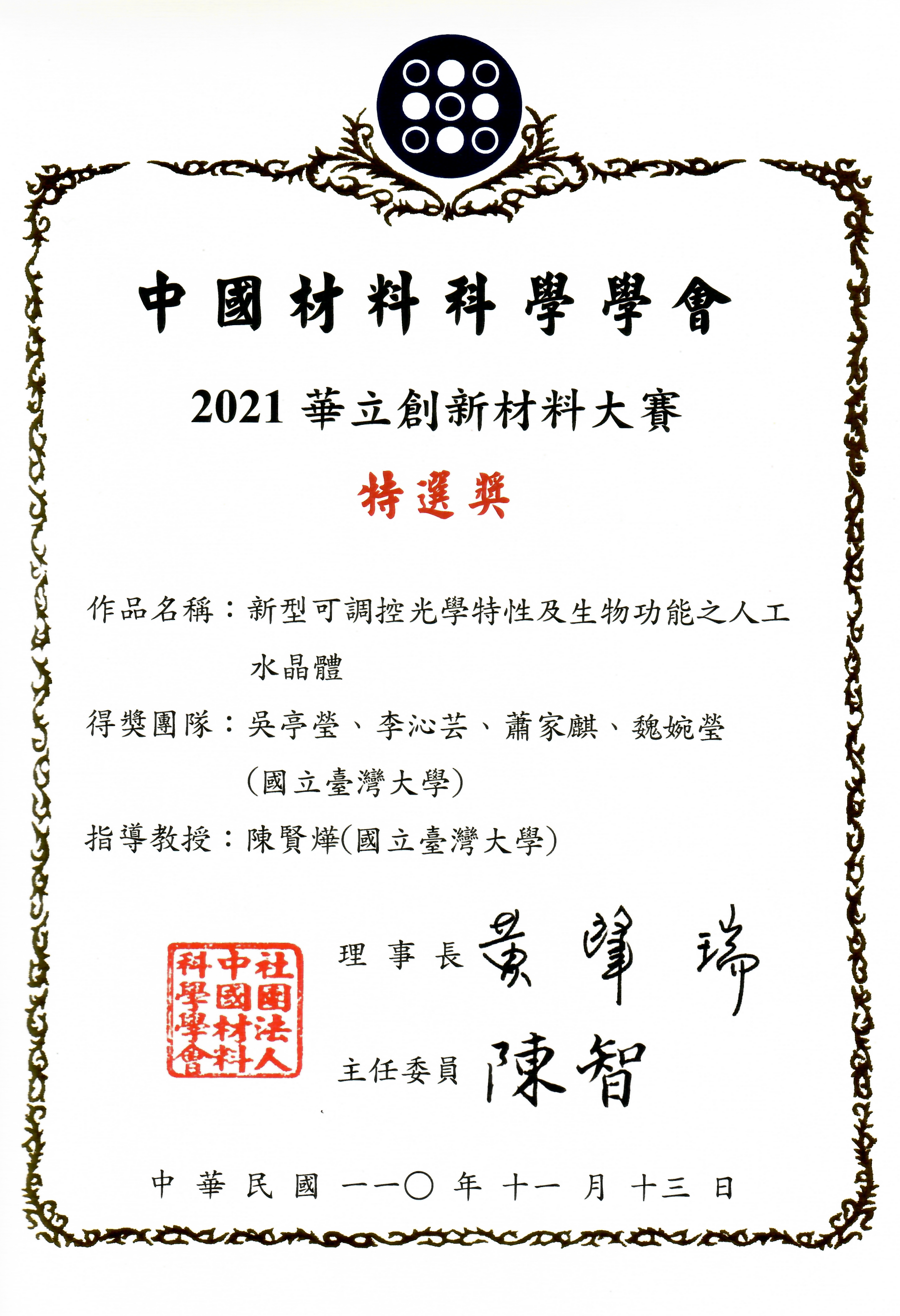 本屆「華立創新材料大賽」,得獎作品創意十足,展現與產業接軌的無限商機,由本系陳賢燁教授研究團隊以「新型可調控光學特性及生物功能之人工水晶體」為題榮獲「特選獎」,在面對3C產品日漸普及化及高齡社會的到來,白內障患者數量激增以及年輕化的趨勢,陳教授團隊利用氣相製程來封裝液體的技術,打造新型可調控的人工水晶體,以液體式仿生設計具有肌肉調節能力,解決有限焦距、夜間光學干擾、定位偏移等臨床上的需求痛點,產品同時具備「光學操控」及「生物功能性」,並具有仿生設計、獨家表面修飾技術、綠色製程等特點,期望此創新材料及技術能夠引領新一代的生醫元件應用於其他生醫材料市場。