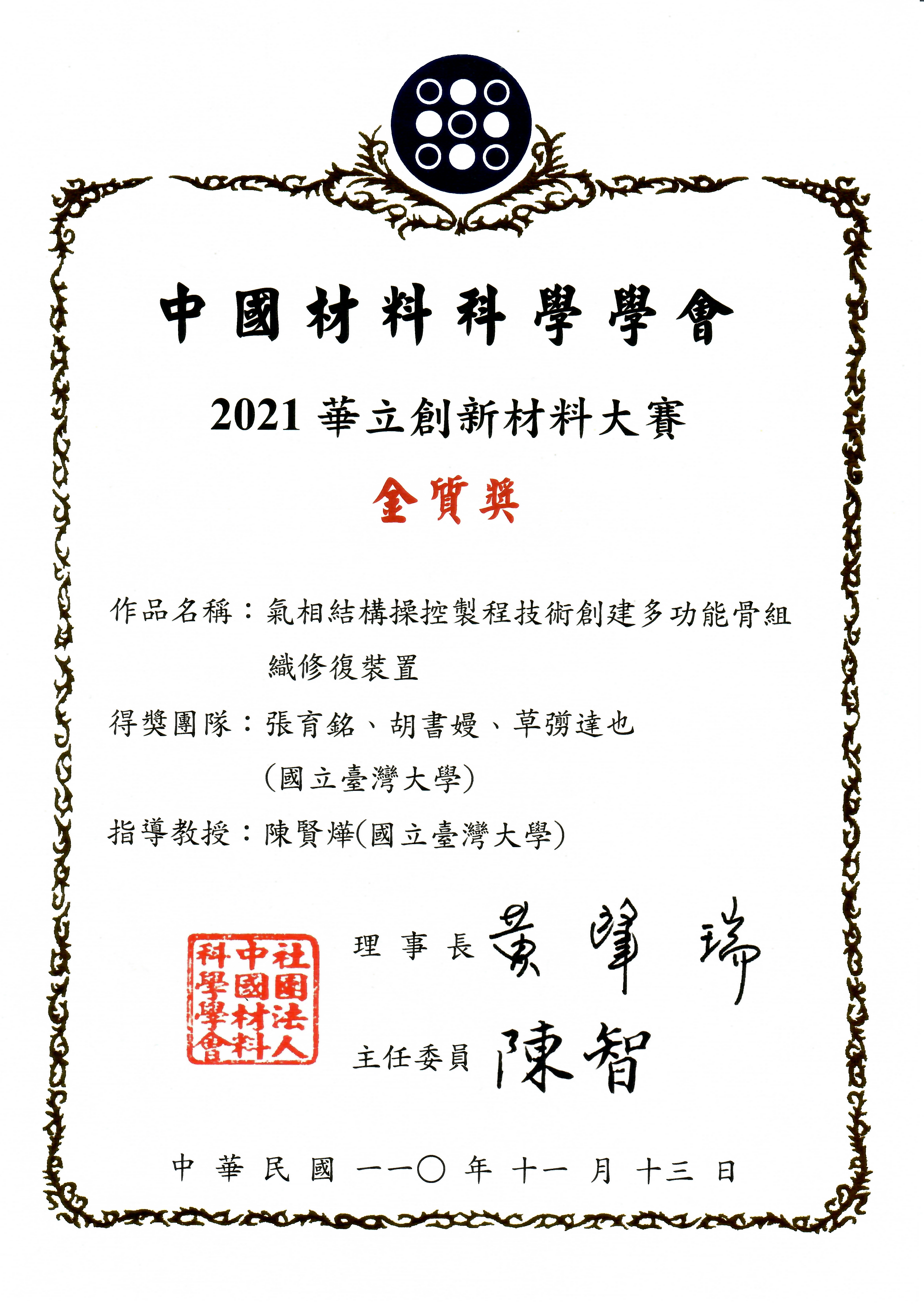 本屆共有來自全國20所大學院校、54件創新作品參與競賽,由本系陳賢燁教授研究團隊以「氣相結構操控製程技術創建多功能骨組織修復裝置」為題榮獲「金質獎」,陳教授團隊以氣相乾式潔淨製程技術打造奈米級多孔材料,用於軟骨組織修復,期盼關節炎患者能恢復到術前的生活品質。此製程有別於傳統氣相沉積形成薄膜的概念,實現氣相製程創建三維立體多孔材料,並在製作過程中包覆各種生物功能性分子以因應不同的醫療需求,例如:富含血小板血漿PRP分子、蛋白質、生長因子等,使得孔洞材料具備對應之功能性,透過包覆患者自體血小板血漿或骨髓間質幹細胞,作為修復受損部位之植入物,此多功能骨組織修復裝置可客製化材料大小、軟硬度等特性,具有幹細胞精準治療之發展潛力。