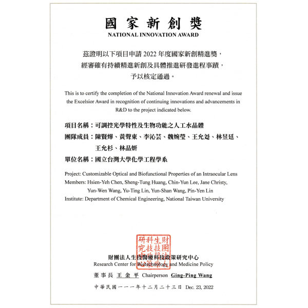 2022年度國家新創精進獎可調控光學特性及生物功能之人工水晶體