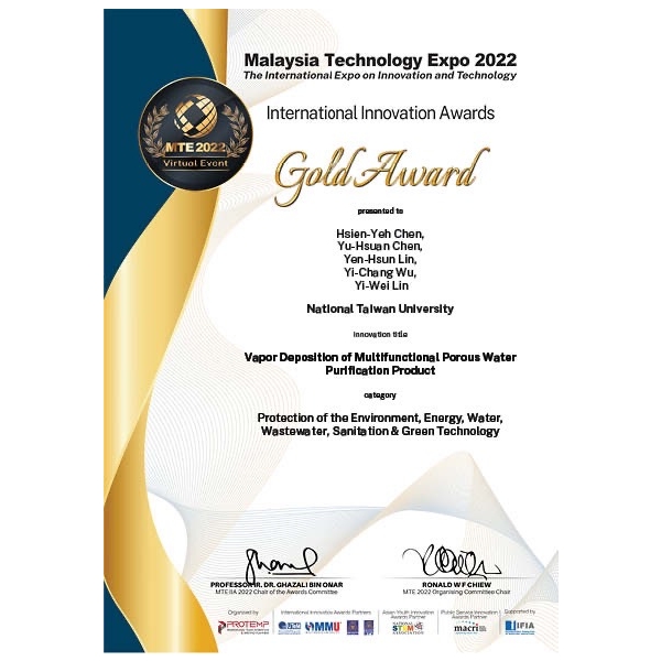 首度參賽就拿到金牌,台灣大學化工系教授陳賢燁帶領學生陳諭萱、吳易倡、林彥勳、林奕維等人,歷時3年,研發出「氣相沉積製程技術創建多功能濾水裝置」,彷彿「膠囊濾水器」。