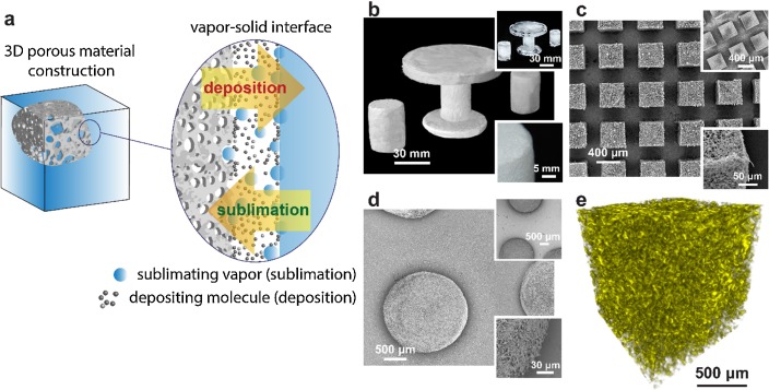 Three-dimensional porous structures are constructed via vapor deposition onto a sublimating solid template. Construction upon deposition of vapor-phase material occurs at a dynamic vapor–solid interface and is directed by the solid surface vanishing by sublimation. A proof-of-concept demonstration showed vapor depositions of poly-para-xylylenes (PPXs) on sublimating templates, including ice and mixtures with ethanol and hexane. The material construction macroscopically produces a replica architecture of the parent template. Characteristics of the pore structures are formed during the construction process as a result of the gas vapor and the space that is vacated by sublimation, thus enabling control of the porosity through regulation of the sublimation speed and/or the thermodynamic properties of the templates. The technology introduced herein provides a novel approach for 3D porous material manufacturing and overturns the notion that vapor deposition necessarily forms dense thin films on substrates.